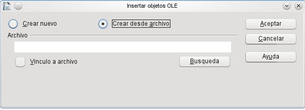 En el cuadro de diálogo Insertar objetos OLE, elegimos Crear desde archivo y luego hacemos clic en el botón Búsqueda. Buscaremos la hoja de cálculo que tiene los gráficos y al pulsar Aceptar tendremos el archivo de Calc en una ventana de objeto dentro del procesador.