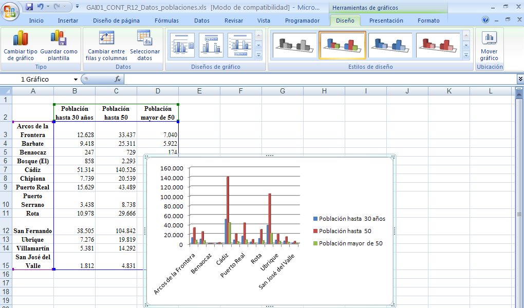 Lo primero es que, de nuevo, lo ideal es partir de una hoja de cálculo, en esta ocasión de Excel. Tenemos datos numéricos para representar. Podemos usar el mismo archivo fuente de antes (GAI01_CONT_R12_Datos_poblaciones.ods). Como estaba hecho en OpenOffice, tan solo tenemos que abrirlo con OpenOffice y guardarlo como Microsoft Excel (Archivo>Guardar como y en Tipo de Archivo elegimos Microsoft Excel).