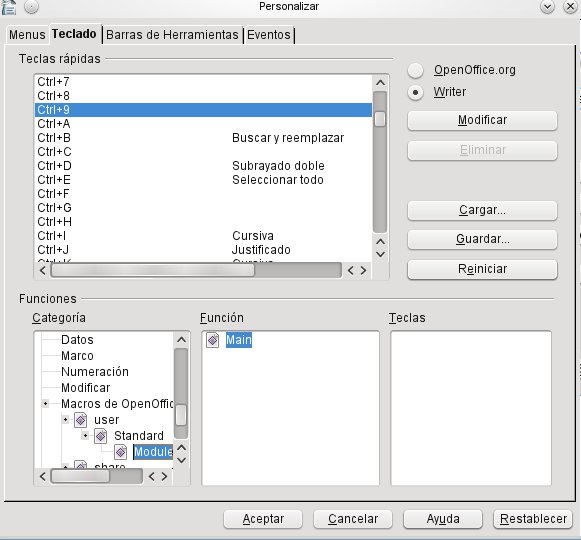 - Para asignar una combinación de teclas a la macro nos vamos a Herramientas>Personalizar>Teclado.