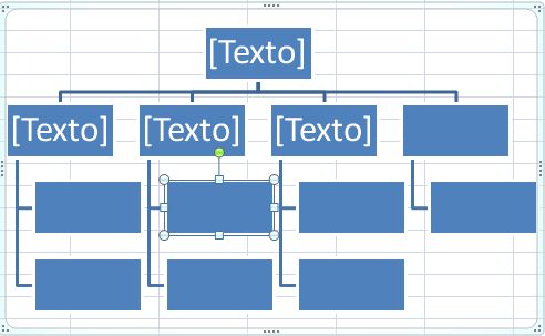 - En la parte izquierda podemos escribir el texto que contendrá cada forma. También podemos hacerlo sobre la propia forma. Además observaremos que el tamaño del texto se ajusta automáticamente a la forma. Pero antes de introducir el texto recomendamos crear todas las formas que se necesiten. Lo más cómodo es seleccionar una de ellas. Si queremos eliminarlo solo tenemos que pulsar la tecla Supr (suprimir). Si lo que queremos es añadir una nueva forma (en este caso un rectángulo) con el botón derecho tenemos la opción de Agregar forma y con ella 4 opciones: detrás o delante incluirán una forma en su mismo nivel, superior o debajo la incluirán en el nivel superior o inferior respectivamente. Si queremos un organigrama como el que hicimos con Impress tendremos que Agregar formas hasta que nos quede así: