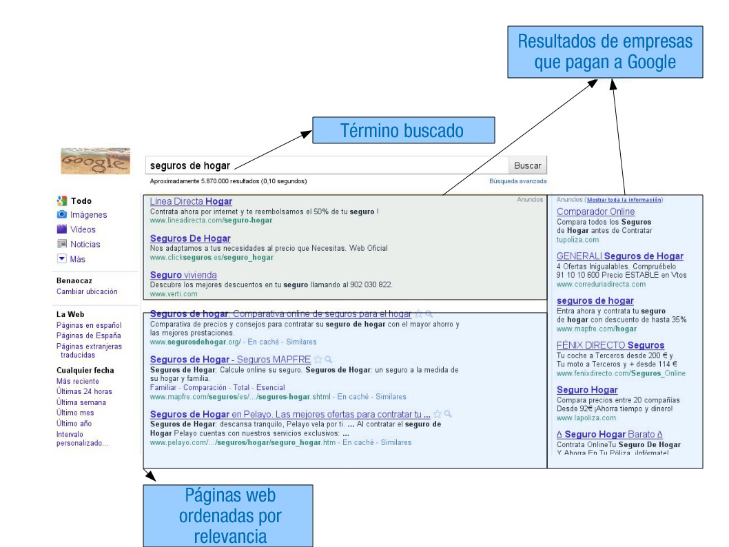 La importancia comercial de los buscadores viene dada por la publicidad que hacen las empresas en ellos. Google ofrece en las búsquedas unos resultados destacados que corresponden a empresas que pagan por aparecer en ellos cuando se inserta un término relacionado con lo que venden, a continuación encontramos resultados ordenados por relevancia. Esta relevancia viene dada por el algoritmo de búsqueda. Uno de los criterios es que la página web que contiene el término buscado tenga muchos enlaces de otras páginas que apuntan a ella, el número de visitantes que tiene y otros criterios que la empresa guarda con celo para que nadie consiga los resultados de su buscador.