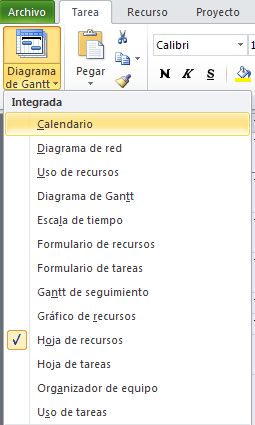 Ya tenemos localizados los recursos, pero... habrá que hacer algo con ellos ¿no? Una vez que en la hoja de recursos hemos determinado todos los que formarán parte de nuestro proyecto, se trata de asignarlos a las tareas. La hoja de recursos la desplegamos en la ficha Tarea, en el desplegable donde pone Diagrama de Gantt.
