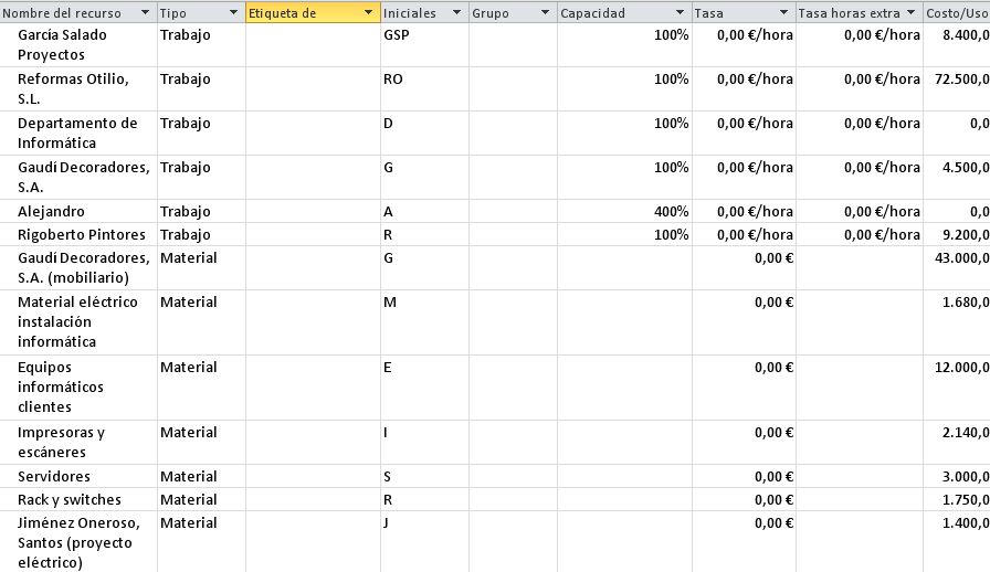Una vez creados los recursos, asignarlos a las tareas es muy fácil. Si nos vamos a la vista Diagrama de Gantt, tenemos en la izquierda toda la lista de tareas. En la columna Nombre de los recursos podemos seleccionar aquellos que pertenecen a esa tarea. Como puedes comprobar, se pueden asignar varios a una misma tarea.