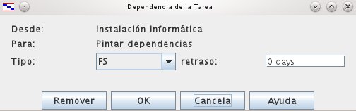 Por defecto, las dependencias entre tareas ya hemos dicho que se hacen Fin a Comienzo, pero también pueden existir tareas que tengan una dependencia Comienzo a Comienzo (el comienzo de una tarea hace que empiece también la otra), o Fin a Fin (una tarea no puede terminar mientras no termine la otra), o incluso Comienzo a Fin (el inicio de una tarea es lo que determina el fin de la otra). Para cambiar el tipo de dependencia hacemos clic (doble clic en Project) en el diagrama de Gantt en la línea que une las tareas, y tenemos un desplegable para cambiar el tipo de dependencia. En Project pueden aparecer las dependencias con las siglas en inglés: (FS, Final o Start-Comienzo).