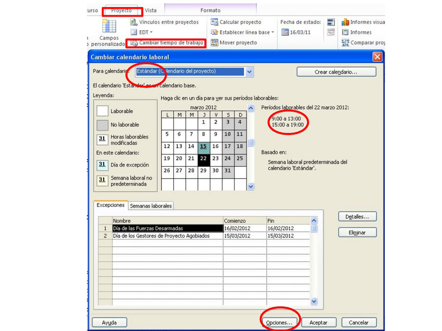 El calendario general o estándar. Se le asignará por defecto a todas las tareas y recursos del proyecto. Este calendario general debería tener bien determinados los días laborables que realmente tiene la empresa. En Project lo tienes en la ficha Proyecto>Cambiar tiempo de trabajo. En ese cuadro de diálogo tienes un desplegable en el que seleccionar el calendario que vas a modificar. En el apartado Excepciones puedes determinar los días festivos. En el botón Opciones puedes acceder a las líneas generales de todos los calendarios: hora de comienzo y terminación de la jornada, día de la semana en que comienza el trabajo y demás.
