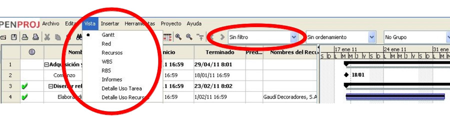 En Openproj tenemos los filtros en cualquiera de las visualizaciones. En el menú Vista tenemos desde Gantt a Detalle de uso de Recursos. En todas las Vistas podemos aplicar filtros para controlar el seguimiento.