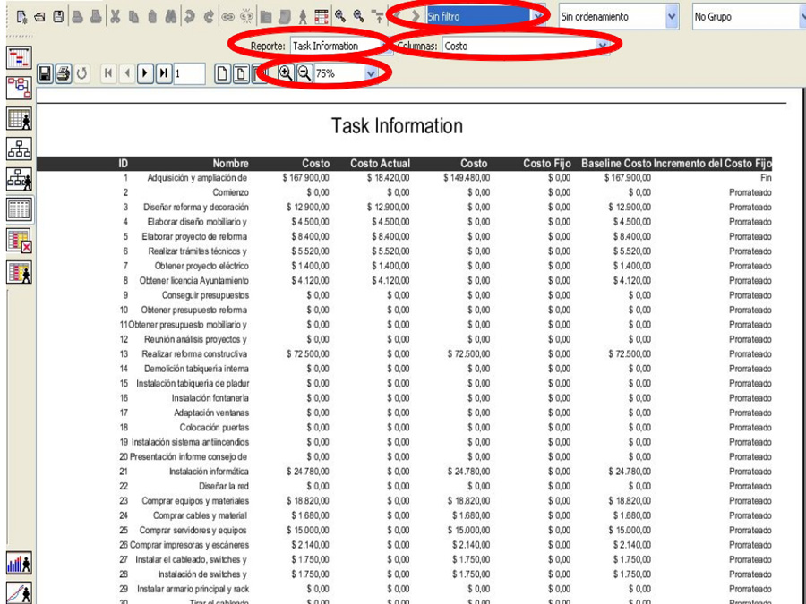 Resulta especialmente interesante a la hora de imprimir los resultados la Vista Informes. En ella tenemos los filtros y podemos seleccionar el informe (Reporte) que queremos ofrecer, así como las columnas de dicho informe que queremos visualizar. Podemos ampliar o disminuir la escala de la visualización. En esta captura te hemos señalado los aspectos más interesantes: