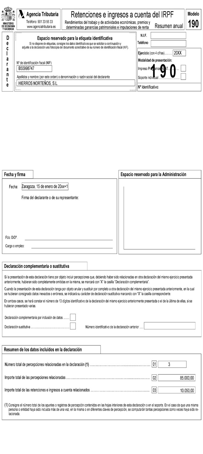 En este resumen, que se cumplimenta en el modelo 190, se harán constar los datos de la empresa y los de cada trabajador y trabajadora, así como las retenciones e ingresos a cuenta realizados, indicando la clase de rendimiento del trabajo.