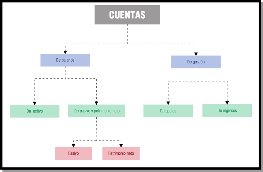 Cuentas de activo, cuentas de pasivo y cuentas de patrimonio neto.