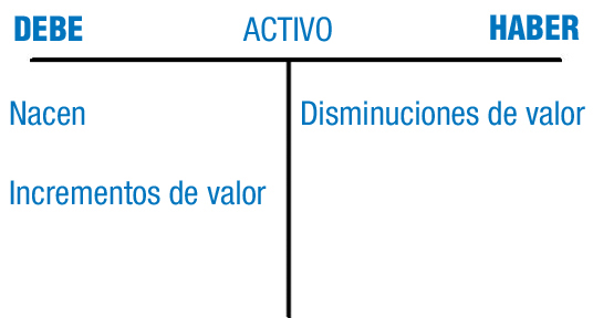 | Cuentas de activo: nacen por el debe, aumentan de valor por el debe y disminuyen por el haber. Representan normalmente saldo deudor o cero. | |